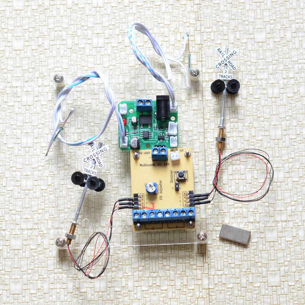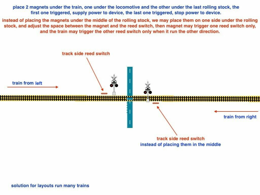 when a magnet under the train trigger a reed switch, the crossing signals begin to flash, and stop when magnet trigger reed switch again.