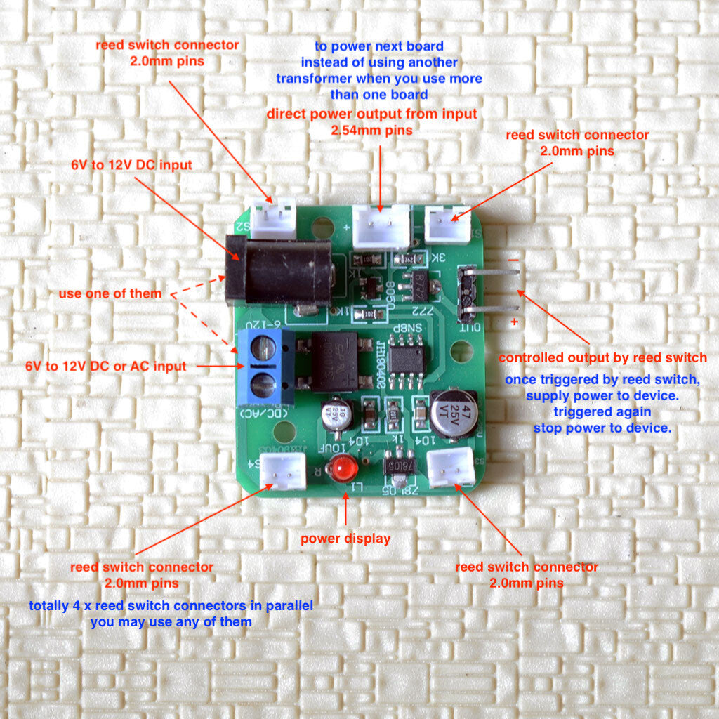 when a magnet trigger a reed switch, this board supply power to device, and when trigger again, stop power to device until next trigger.