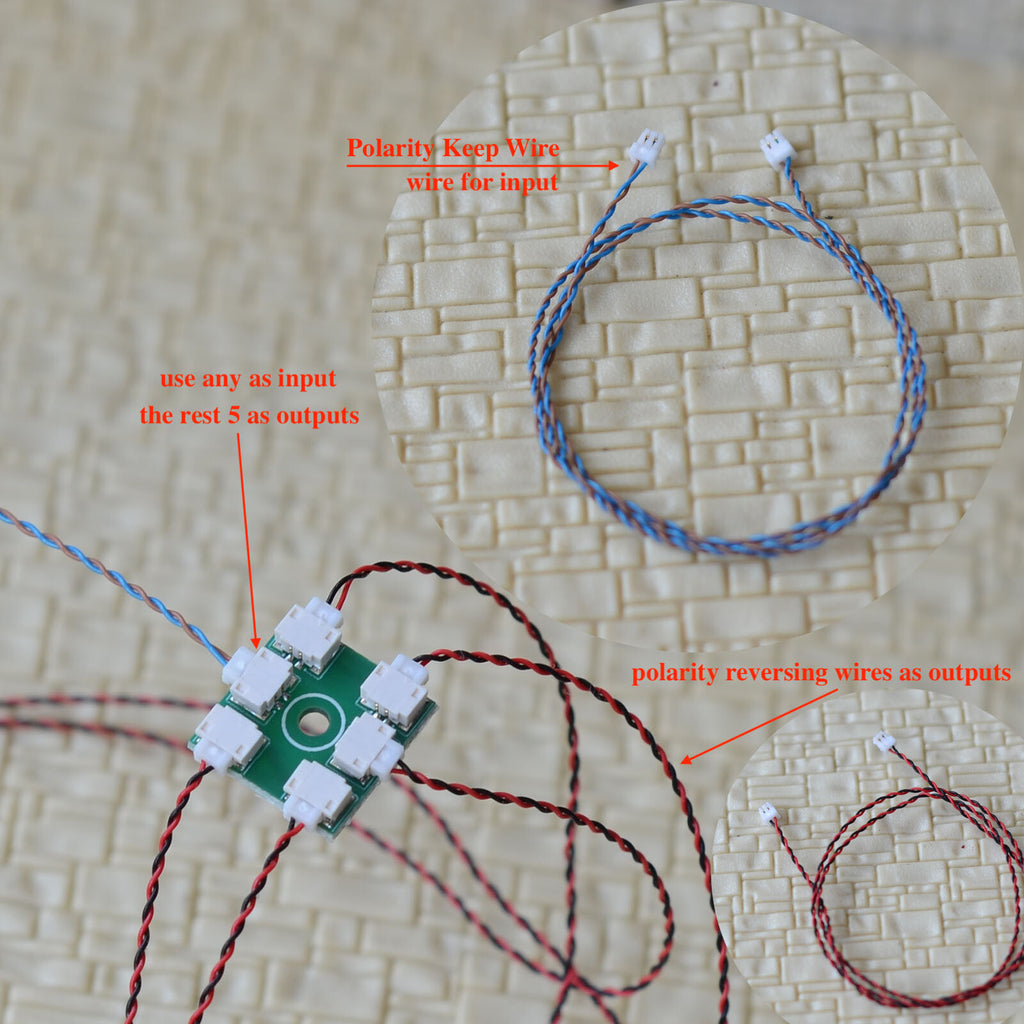 - Totally 6 x JST0.8 sockets, use any one of them as input, and the rest 5 as outputs.