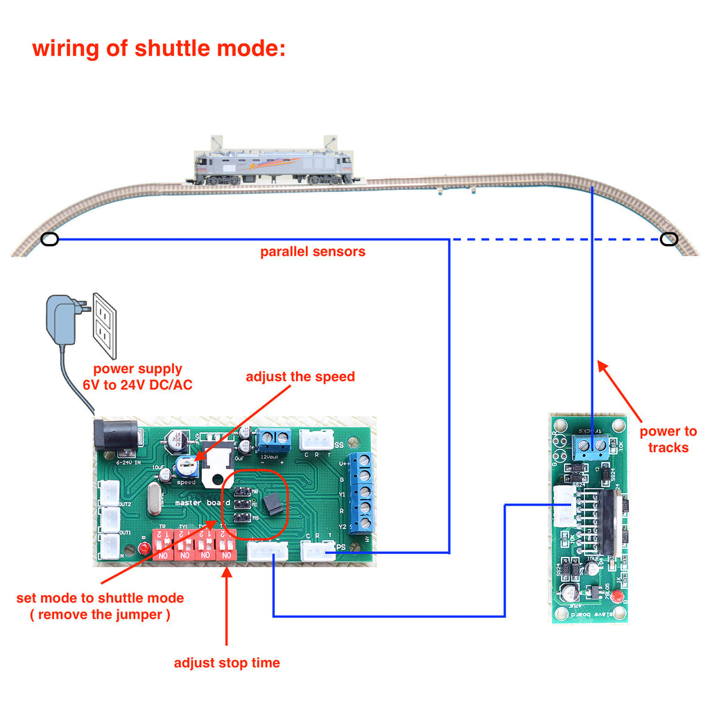 When the train trigger the detector, the slave board will cut off the power to the tracks and stop the train, after the set time, it will power the tracks again and the train will restart. Or run to another direction under shuttle mode.