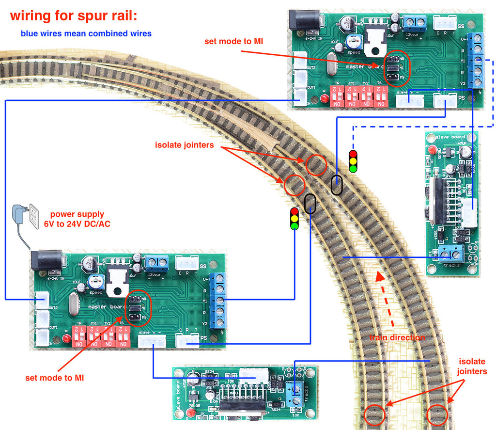 When the train passes the detector, the slave board will cut off power to the near tracks so that no train can get through the near tracks, Once the train has fully cleared the detector, the slave board power the near tracks again so that the near train can restart.