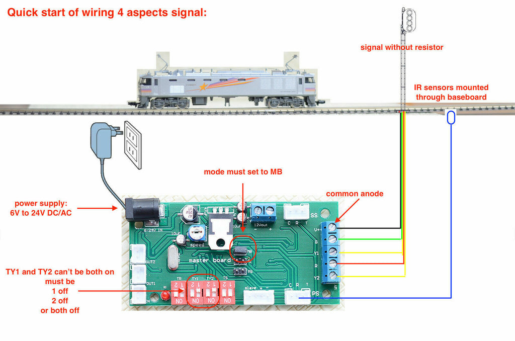 When the train passes the detector, the signal switches to red and keep red, the slave board will cut off power to the near tracks so that no train can get through the near tracks, Once the train has fully cleared the detector, the module switches the signal back to green (via delay red, yellow and double yellow if appropriate), and slave board power the near tracks again so that the near train can restart.