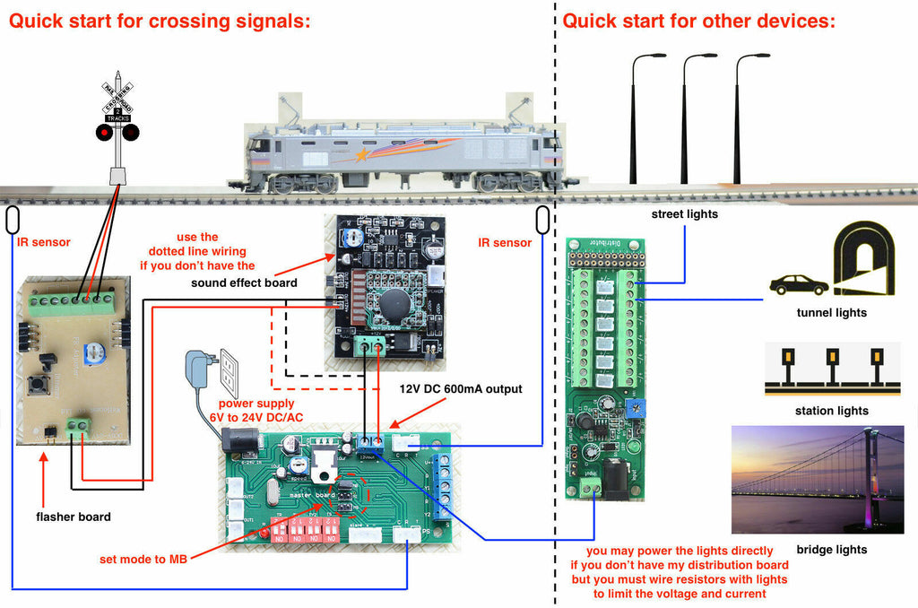 - use it with the crossing signal sound board ( sell separately ) and the flasher board (sell separately ), crossing gate servo ( sell separately ), trigger them automatically by trains.