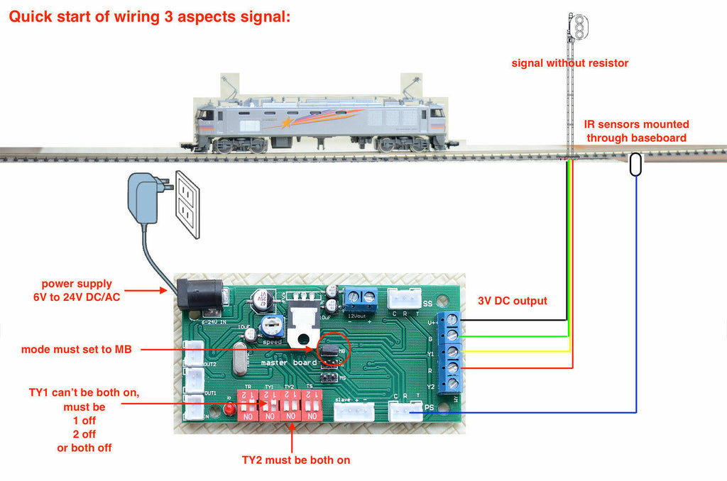 the master board detects trains by bouncing invisible Infra-Red (IR) light off the underside of the rolling stock, or install it on track side, detecting the light reflected back. Once triggered by the train, the module runs built-programs. ( black surface will absorb most IR light, you may stick white tape under the train or use track side sensors )