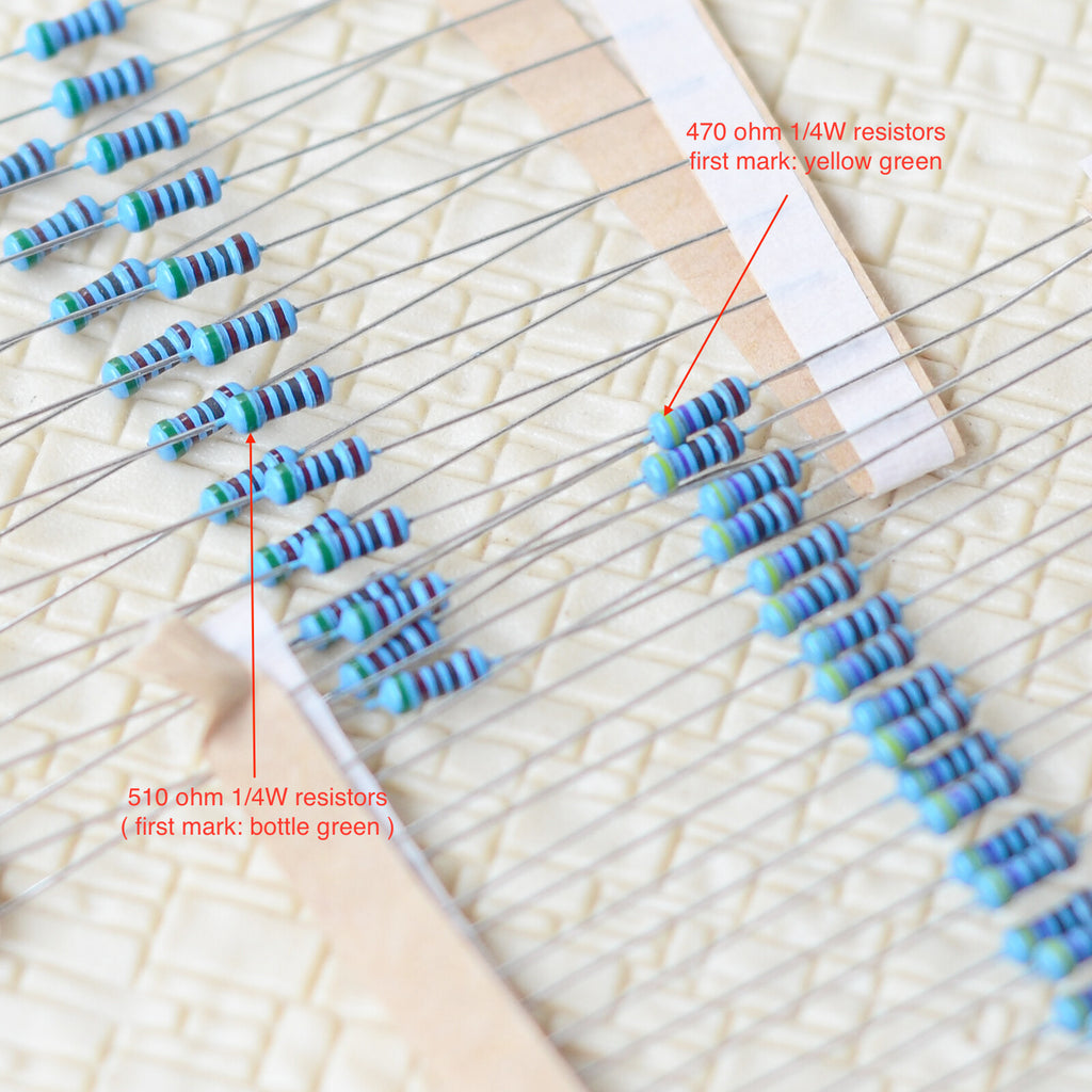 - to light them up at same time, we may solder 470 ohm resistor with green LED and 510 ohm resistor with red or yellow LED.